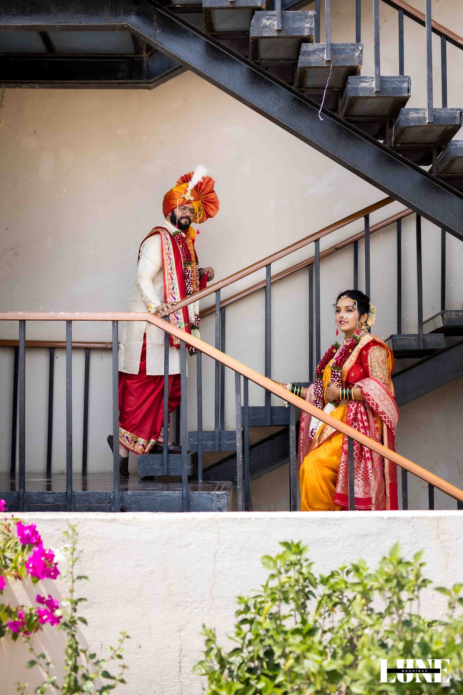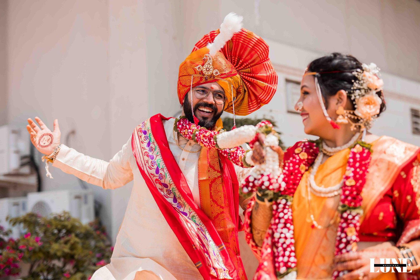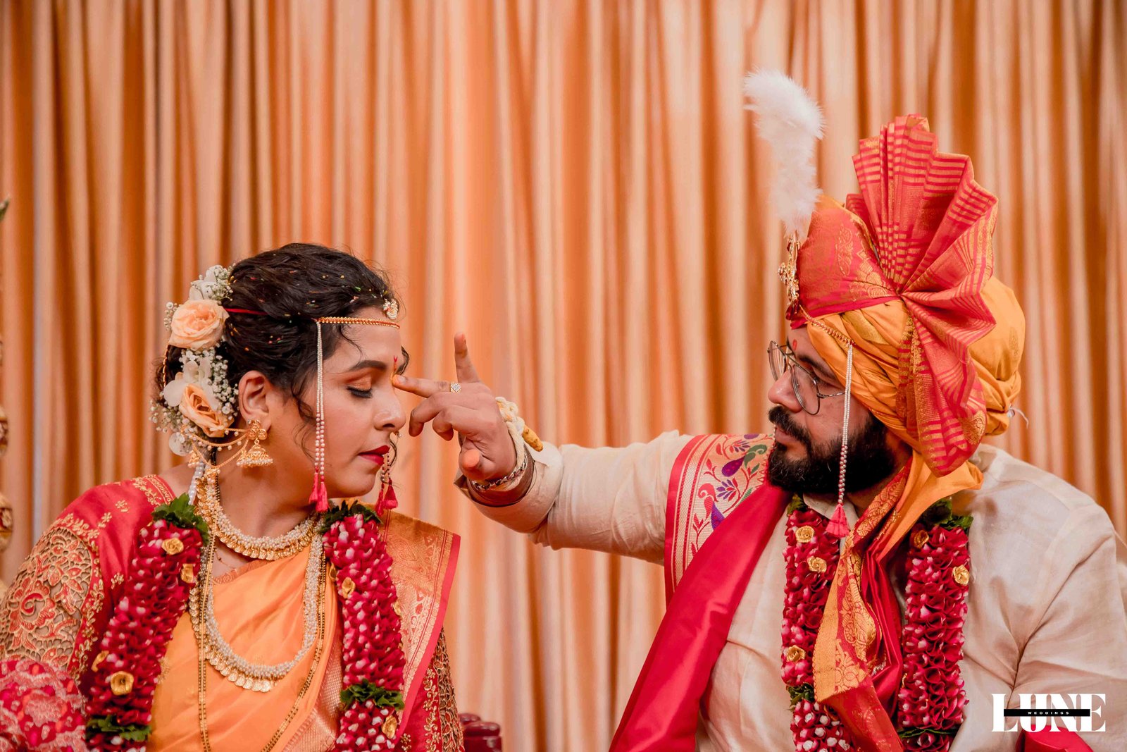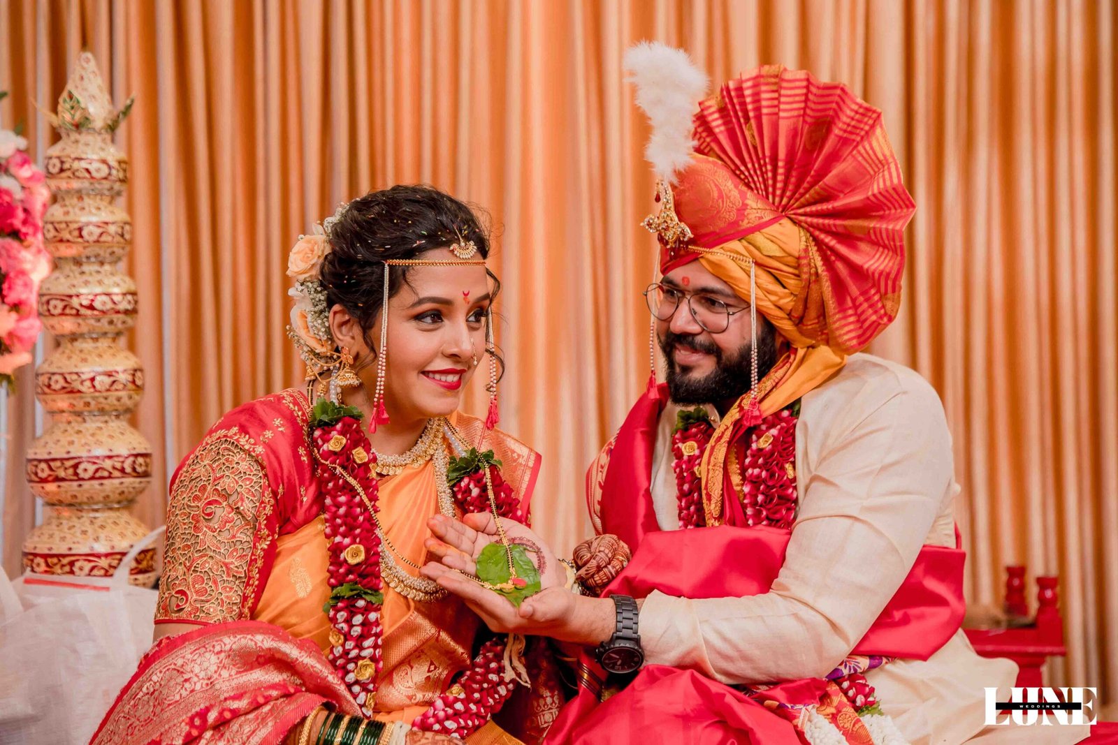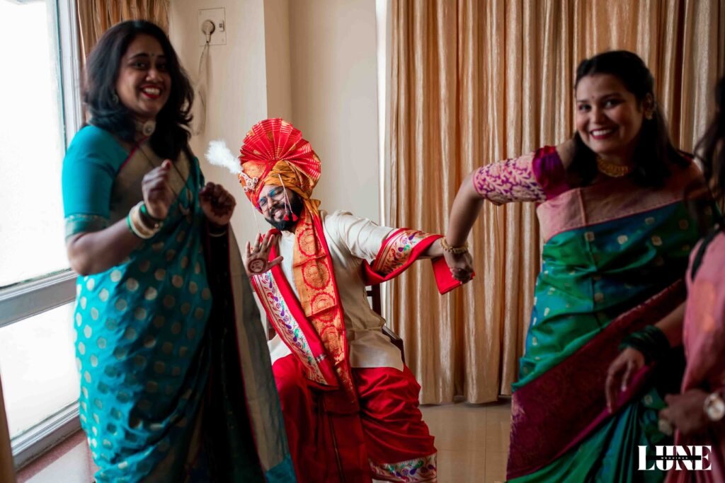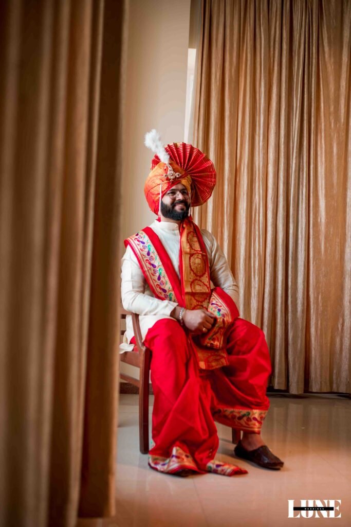 The day began with the gentle fragrance of fresh flowers, the soothing notes of the shehnai, and the happy buzz of family and friends gathering to witness something special. Dressed in classic Maharashtrian elegance, Vihang looked regal in his traditional attire and pheta, carrying a calm confidence that comes from knowing you’re about to marry your forever. Pranoti, radiant in her exquisite saree adorned with a delicate nath and traditional jewellery, was the picture of timeless beauty and quiet happiness.